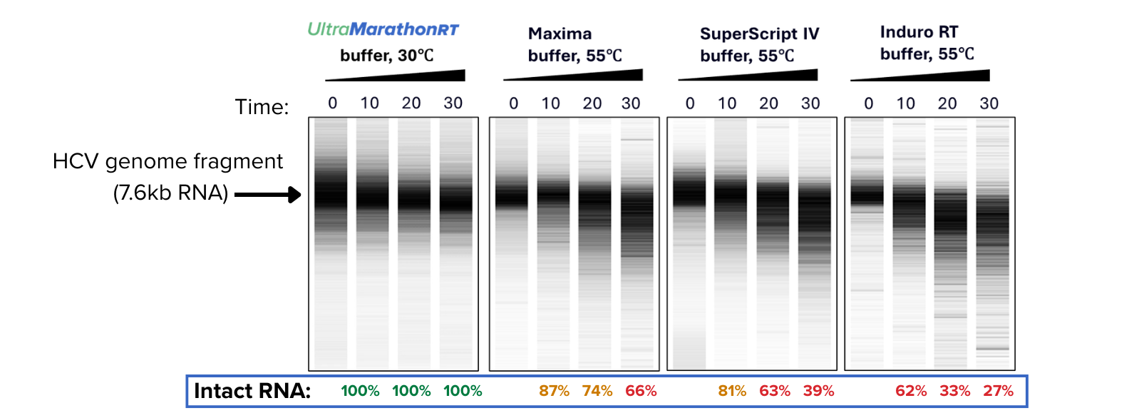 In the figure [right], an HCV RNA was incubated in a diversity of buffer conditions without enzyme to evaluate the impact of temperature on template stability. Samples were analyzed using the Agilent 2100 Bioanalyzer system. Incubation in uMRT buffer at 30ºC shows no degradation of HCV RNA through 30 minutes.