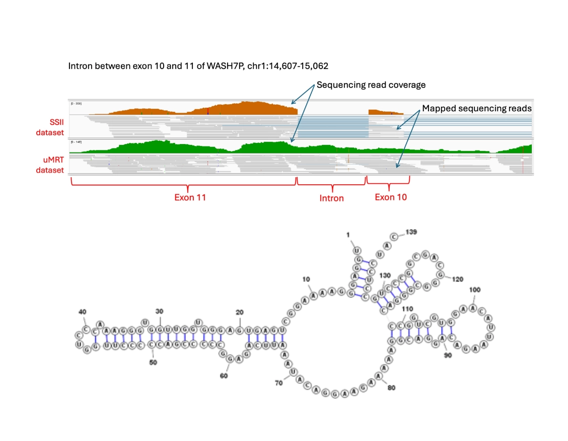 In a representative experiment, there were no sequencing reads from the SSII dataset mapped to the intron sequence between exon 10 and 11 of the WASH7P gene [top] which contains a stable structure [bottom].