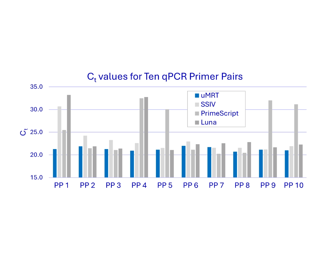 The UltraMarathonRT® Two-Step RT-qPCR Kit sets a new standard in RNA quantification, delivering unmatched sensitivity, reliability,and robustness for researchers. In the figure [right], Ct values for four different RT-qPCR kitsacross all 10 primer pairs are shown. Because the uMRT kit shows no 5’ to 3’ bias and no bias for GC content, the results of the qPCR are very consistent. The competing kits have highly variable results