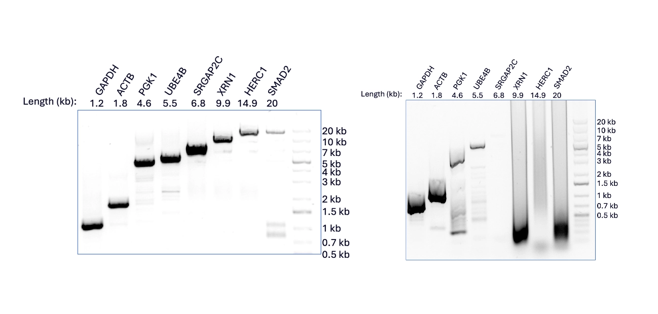 In the figure [right], amplification of transcripts are shown from 1.2 kb to 20 kb using 100 ng Hela total RNA. The cDNAs generated by Induro RT were amplified by LongAmp Taq. Reverse transcription was performed using Oligo(dT)18 primer, but the user can analyze multiple genes from a single RT reaction using a single RT primer. The power of UltraMarathonRT combined with an optimized DNA Polymerase provides superior performance.