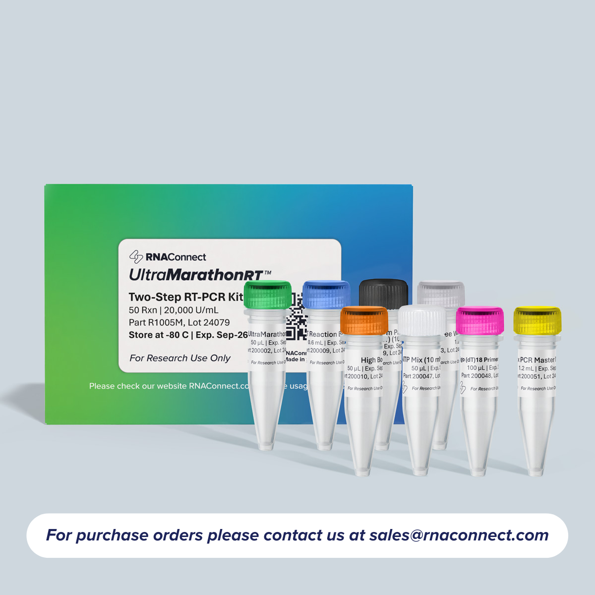 The UltraMarathonRT® Two-Step RT-PCR Kit is a next-generation solution for researchers needing sensitive and faithful RNA-to-cDNA conversion followed by amplification in RT-PCR experiments, regardless of RNA template length, structure, or GC content.